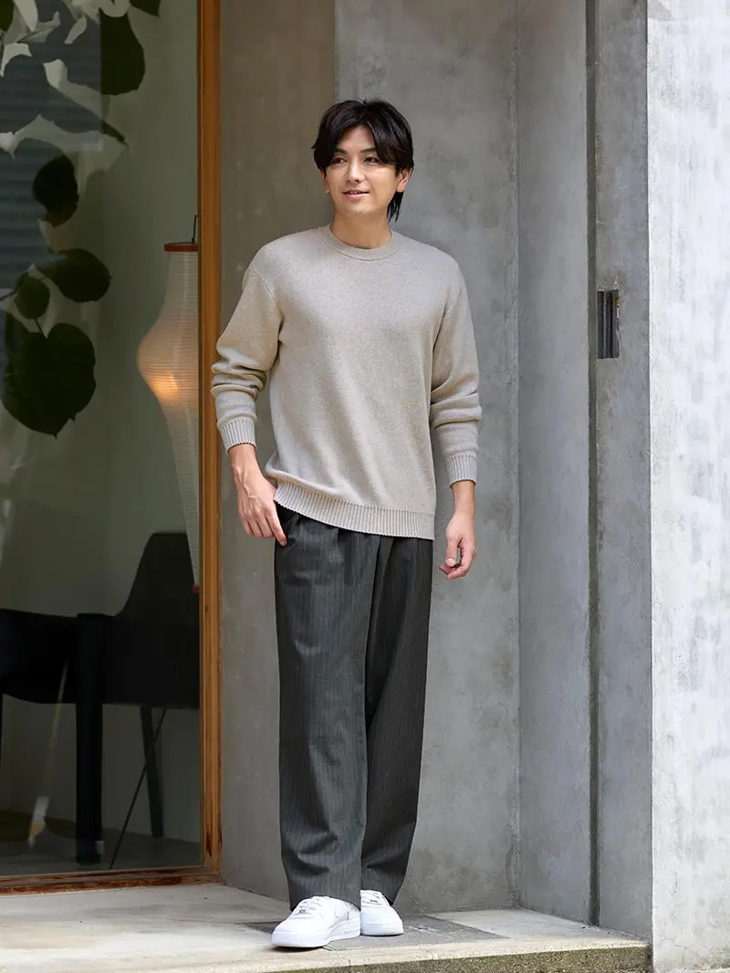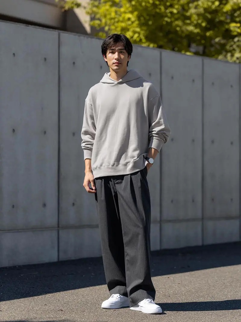 そんな時はボトムスをスラックスにするのがおすすめ。きれいめとカジュアルのバランスが良くなります。