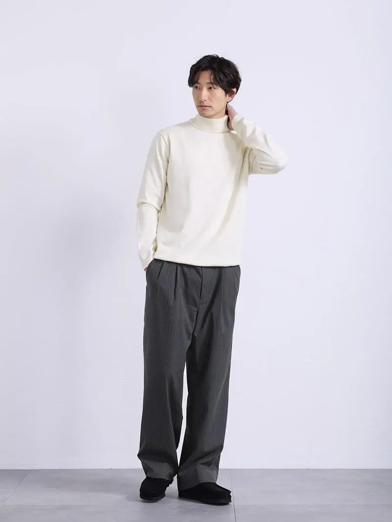 きれいめジャケットは、インナーをタートルネックで合わせて大人カジュアルを表現。
