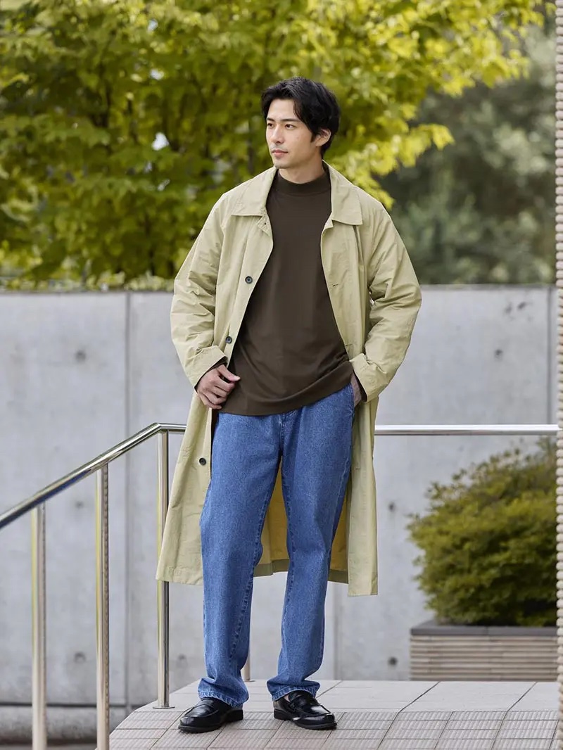 ロングコートをスマートに着こなしたいなら、同系色のアイテムでまとめるのが良いでしょう。