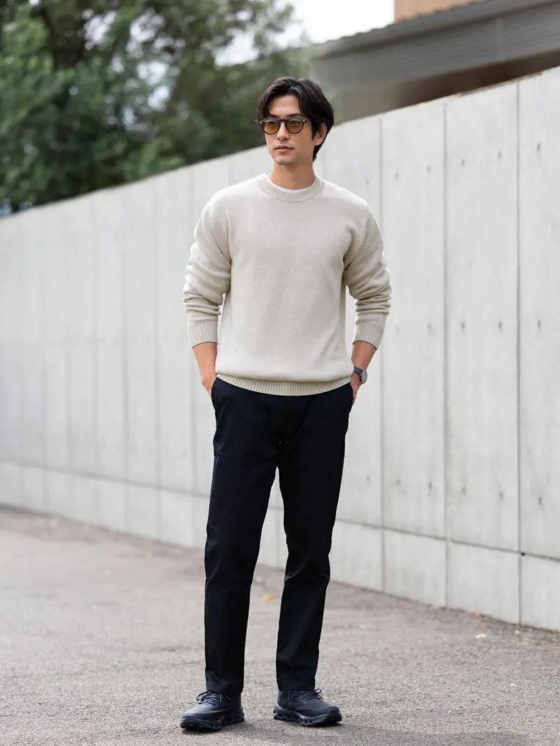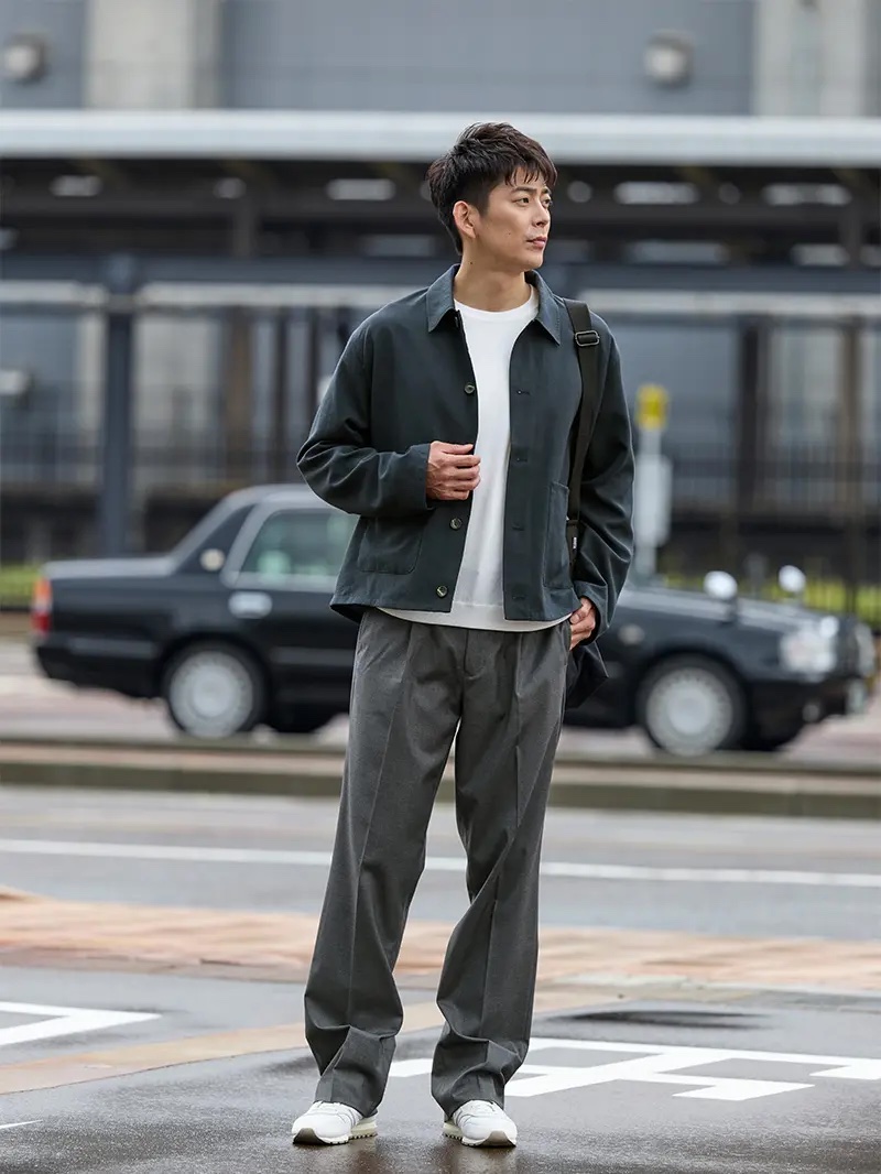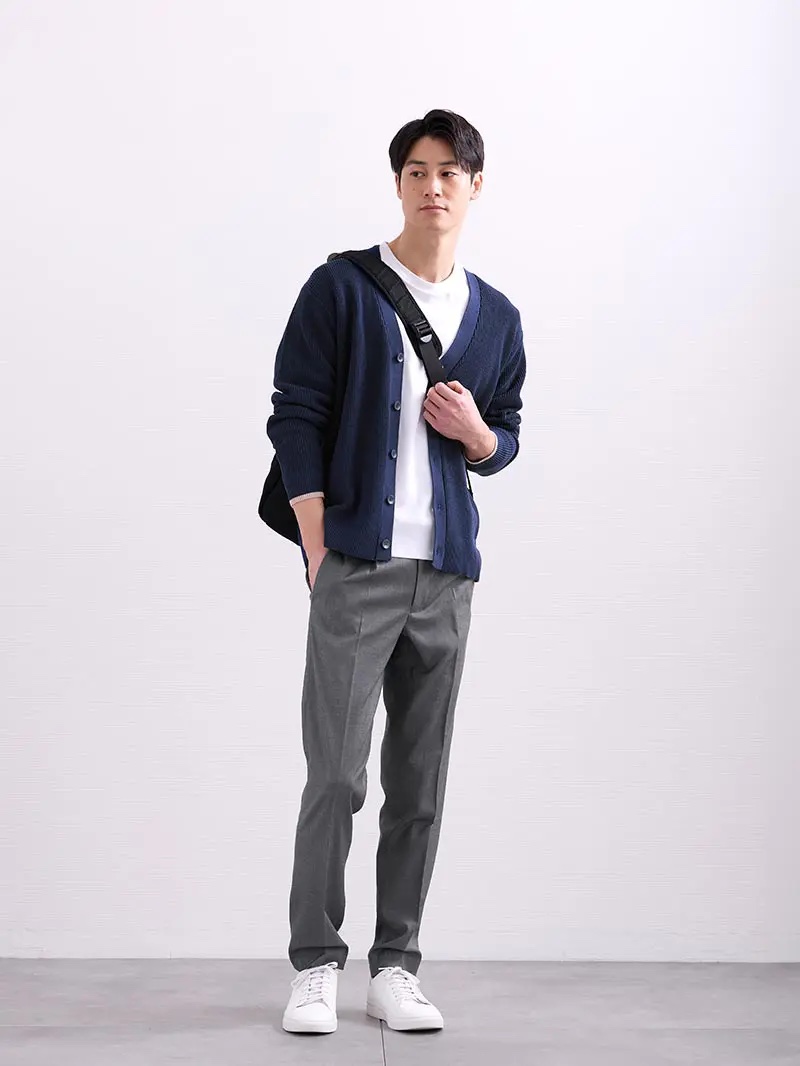 そんな時はボトムスをスラックスにするのがおすすめ。きれいめとカジュアルのバランスが良くなります。