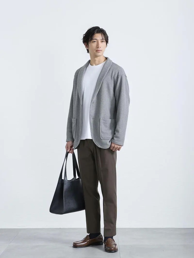 ライトグレーのジャケットに淡いブラウンのボトムスを合わせた爽やかなスタイルも、足元の濃茶色のシューズでコーデを引き締めるのがポイント。