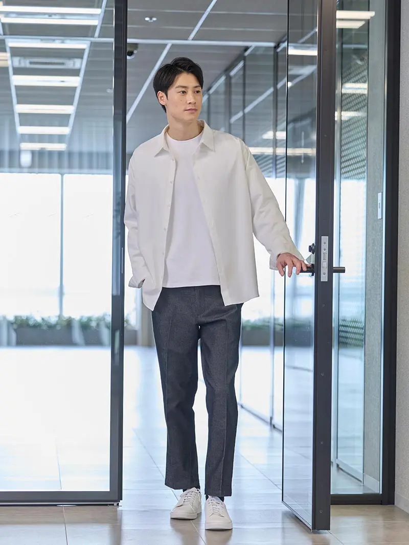 インナーとシューズを白にすることで、脱力感あるカジュアルスタイルを演出できます。